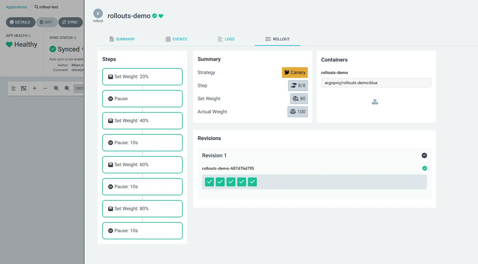 Service test rollouts-demo Synced Healthy service/rollouts-demo created