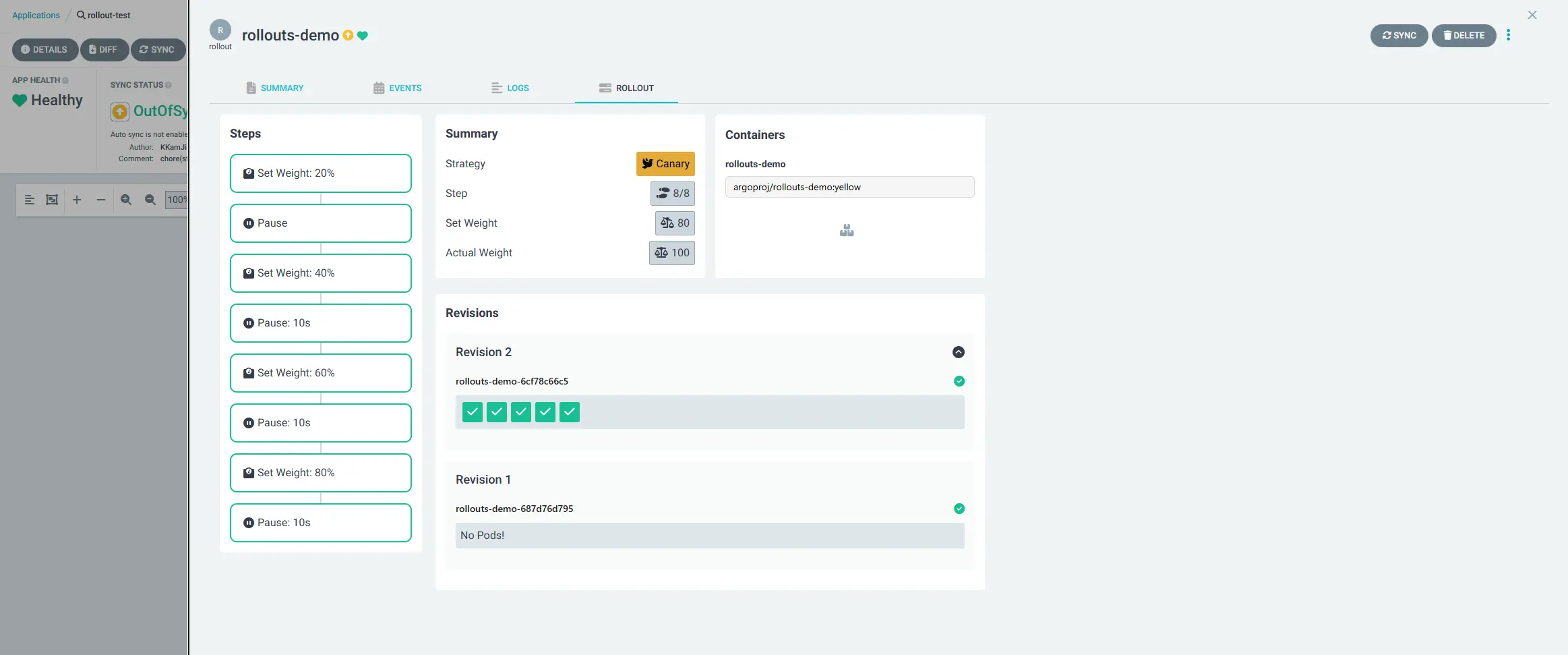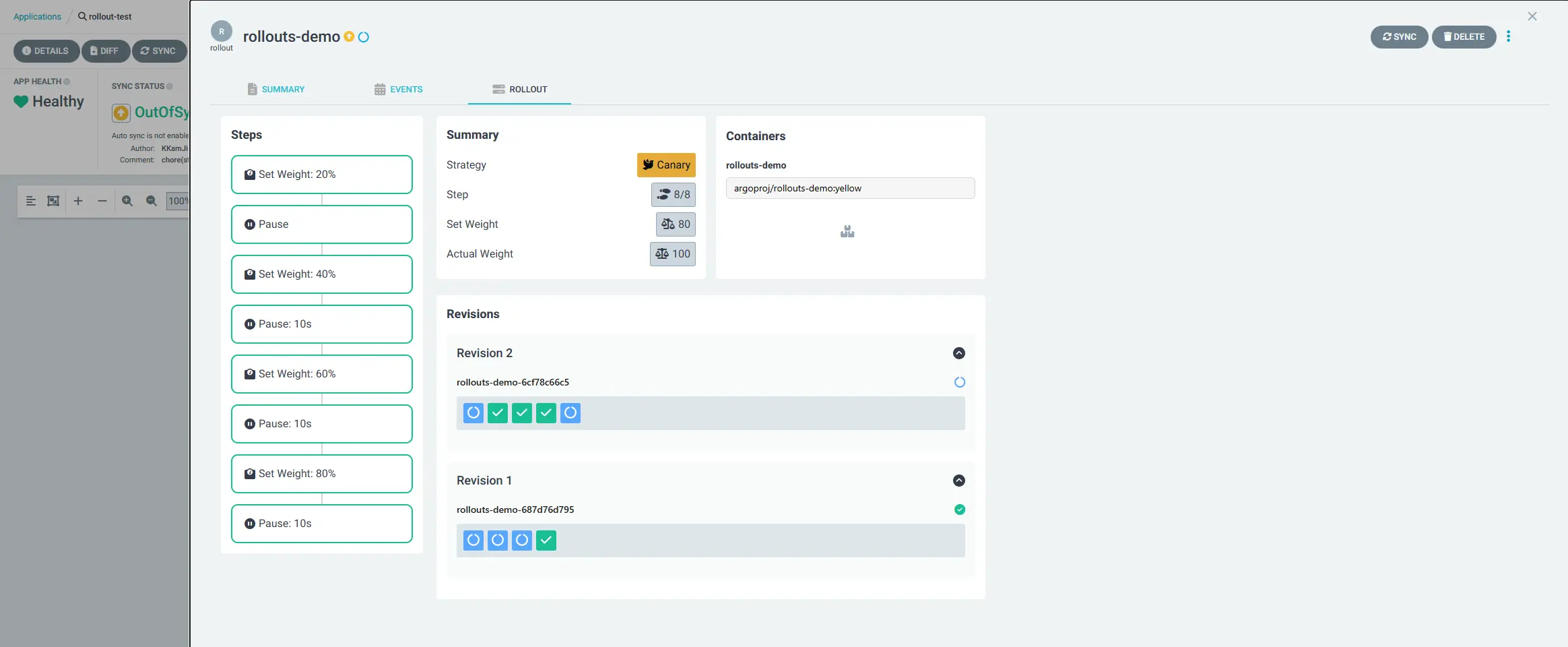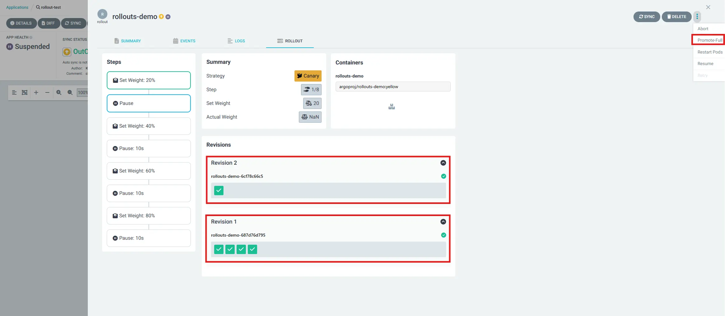 argoproj.io Rollout test rollouts-demo OutOfSync Suspended rollout.argoproj.io/rollouts-demo created