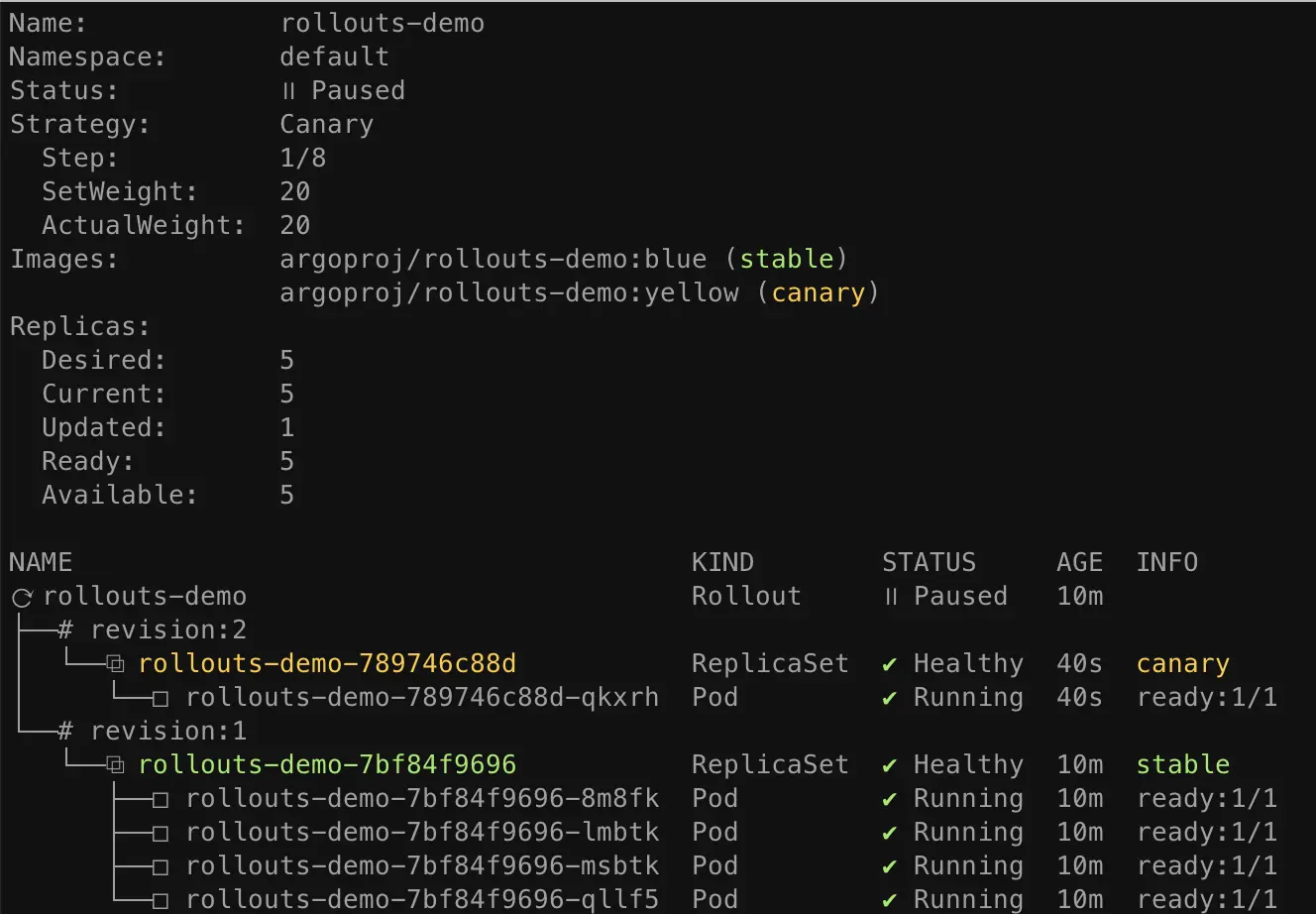Set Weight를 20%로 설정해두었기 때문에 5개의 Pod 중 1개의 Pod만 먼저 배포되고 Paused 상태인 모습을 확인할 수 있습니다. 이 단계에서 새로운 버전(Yellow)에 대한 검증을 진행할 수 있습니다.