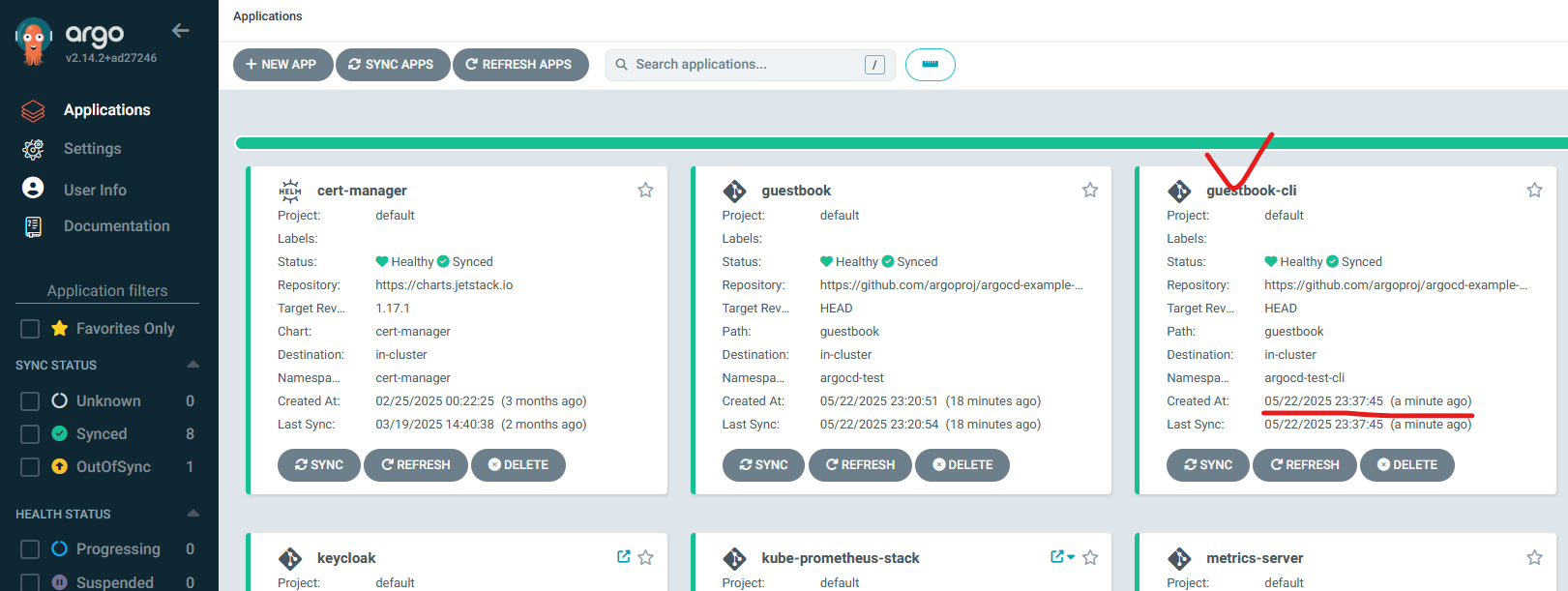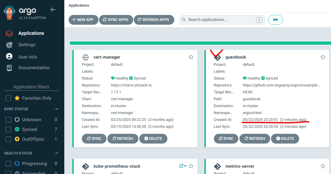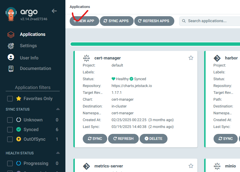 - ArgoCD WEB UI 접속 후, 아래 사진에 보이는