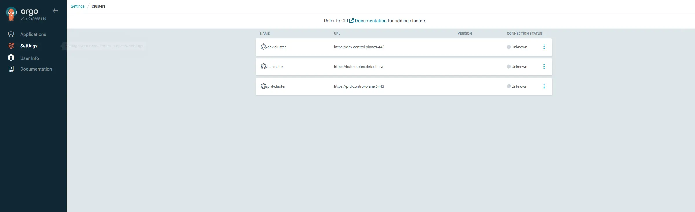 kind-mgmt에 설치된 Argo CD는 kind-prod와 kind-dev 클러스터의 자격 증명을 등록받아, Git 저장소의 변경 사항을 각 대상 클러스터로 동기화(Sync)하는 역할을 수행합니다.