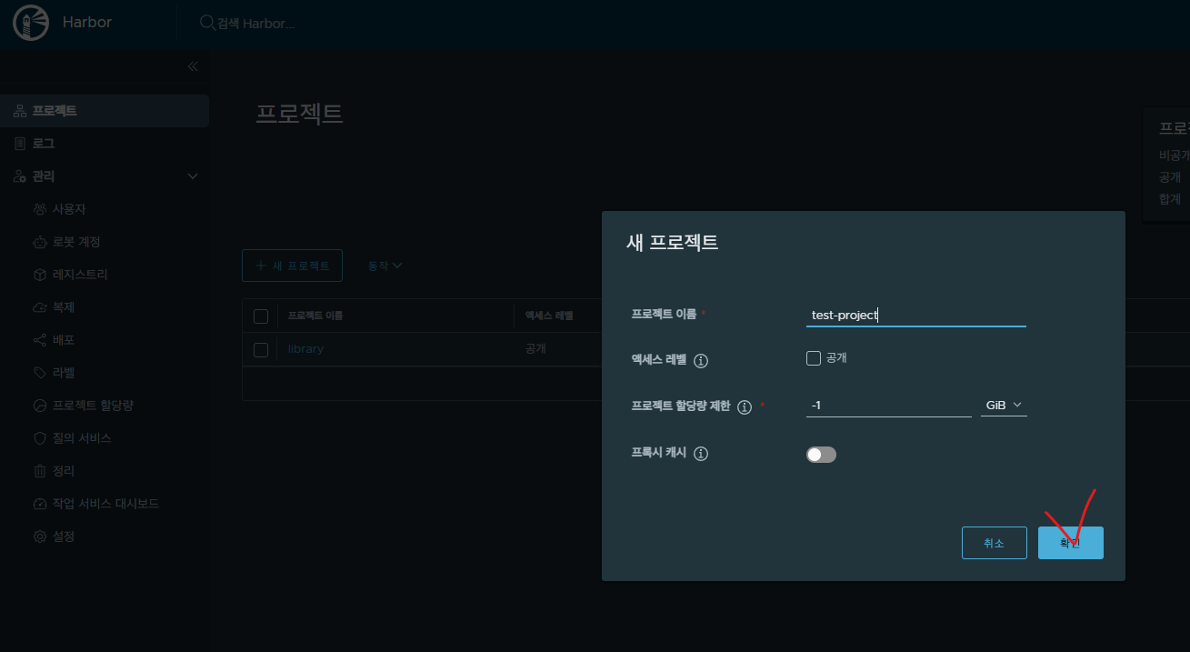 이미지를 업로드하기 위해서는 프로젝트가 생성되어 있어야 합니다. AWS ECR을 사용해보신 분들은 Repository를 생성한다고 생각하시면 될 것 같습니다.