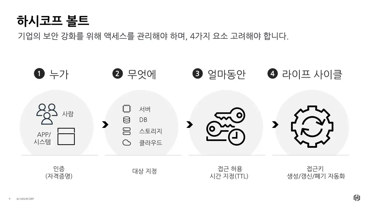 Vault가 권한을 부여할 때는 누가 요청하는지, 어떤 대상에 접근하는지, 권한이 얼마나 유지되는지, 수명주기를 어떻게 자동화할지 한 번에 설계해야 합니다.