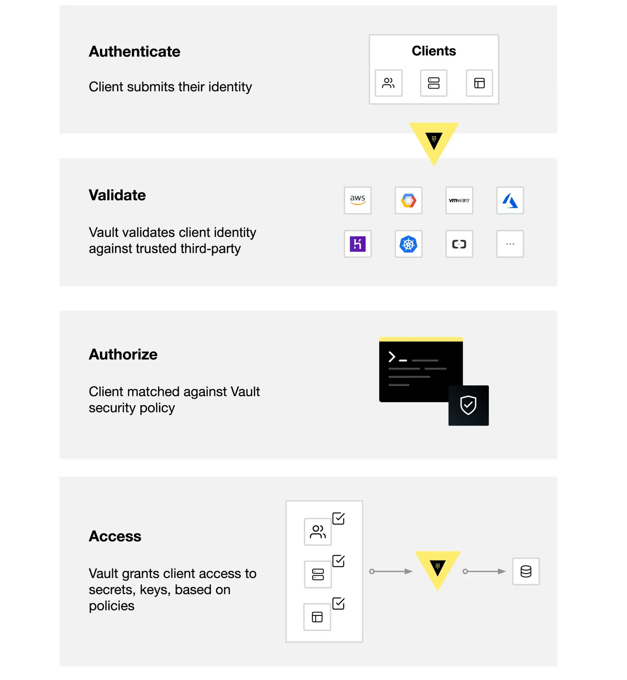 - 검증: Vault가 외부 신뢰 소스(예: OIDC, IAM)와 연동해 신원을 확인합니다.